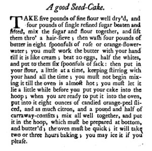 The clip is from The Compleat Housewife: or, Accomplish’d Gentlewoman’s Companion. A similar recipe appears in The Art of Cookery Made Plain and Simple, by Hannah Glasse. You can find it on the Colonial Williamsburg website, along with a translation for the 21st century cook. I think I’ll try it, and I’ll have to start soon to get it right by the end of June.