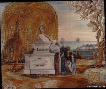 Just because I’m not a fan doesn’t mean I don’t recognize types. In a google image search, I found this item, and knew immediately it was Rhode Island. Made in 1808, it lives at RISD, and a textile designer has done wonderful things based on it. Both RISD’s and the Met’s have the weeping woman, the weeping willow, the urn/cenotaph feature, the pastoral landscape.