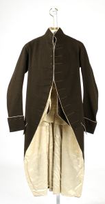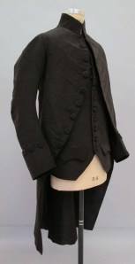 I have a question, though, about those contrast facings and how they were worn — how did they keep the tails, (assuming that facing was a cotton drill, or some kind of wool gab) from clinging to the fabric of the seat of the pants? Also, what did they do about the lack of “slip” in the torso? I have a couple of period tailcoats, but both of them are lined in heavy silk.