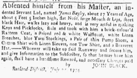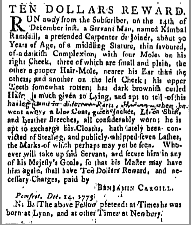 And, knowing that, you will not be surprised that I have found another jacket, closer to home. In the Providence Gazette of January 29, 1774, the man with the “proper hair mole” runs away in a green jacket. He’s also got leather breeches, and they’re on my wish list, though other things must come first, given their expense–things like tires, and allergy drops for the Young Mr.