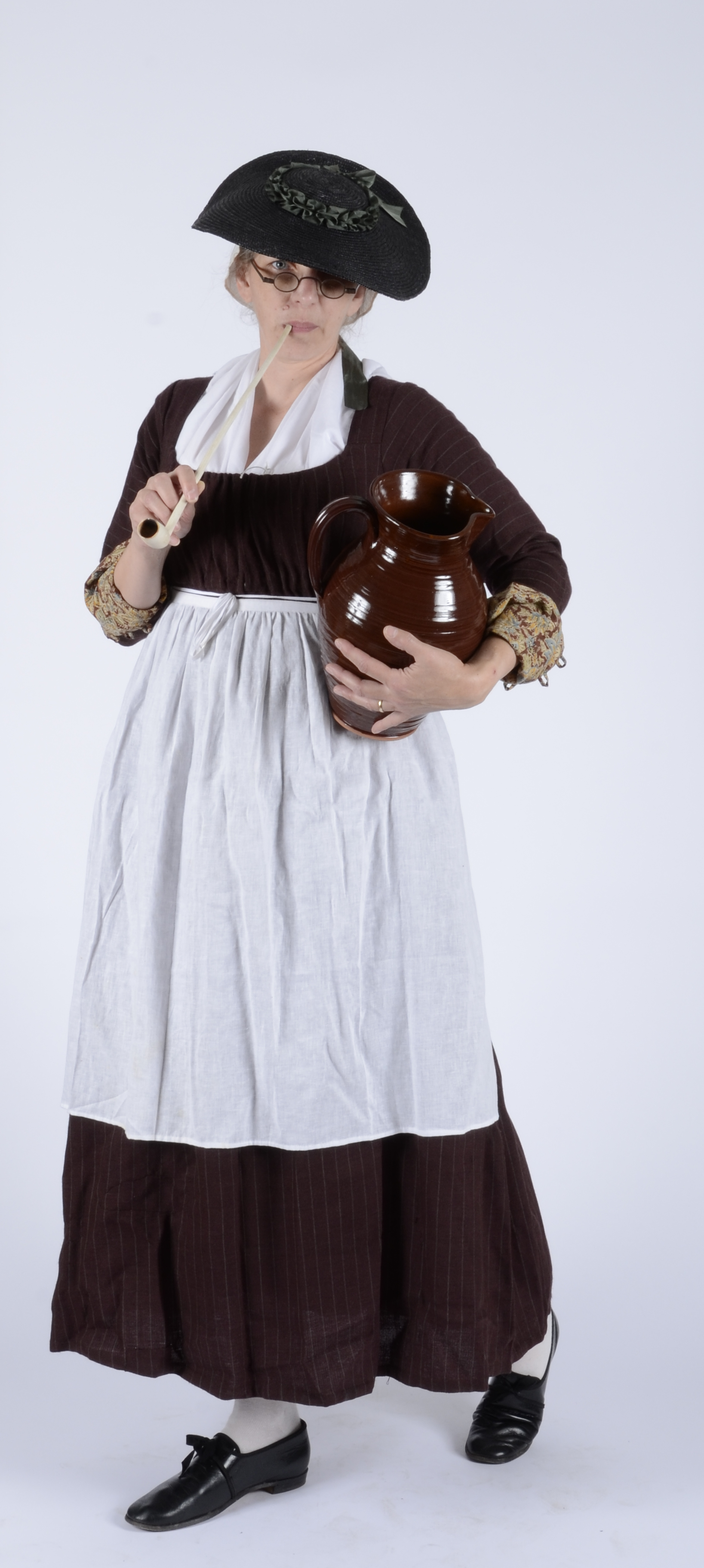 Brown gowns are a fine tradition in the sartorial habits of questionable servants. This young housemaid twirls her mop dry while wearing a brown gown over what could be a dark blue or a black quilted petticoat. The red “bandannoe” is a nice touch, though I don’t think I’ll wear one myself for this event.