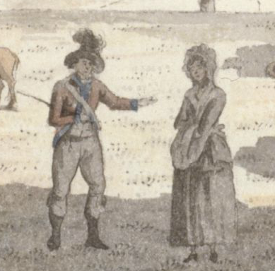 I do also appreciate the short blue jacket/white trousers of the man or boy to the left of the woman, since I know a guy who possesses those clothes and prefers trousers to breeches. He appears to be drinking from a cup as he carries a kettle, presumably of fresh water.