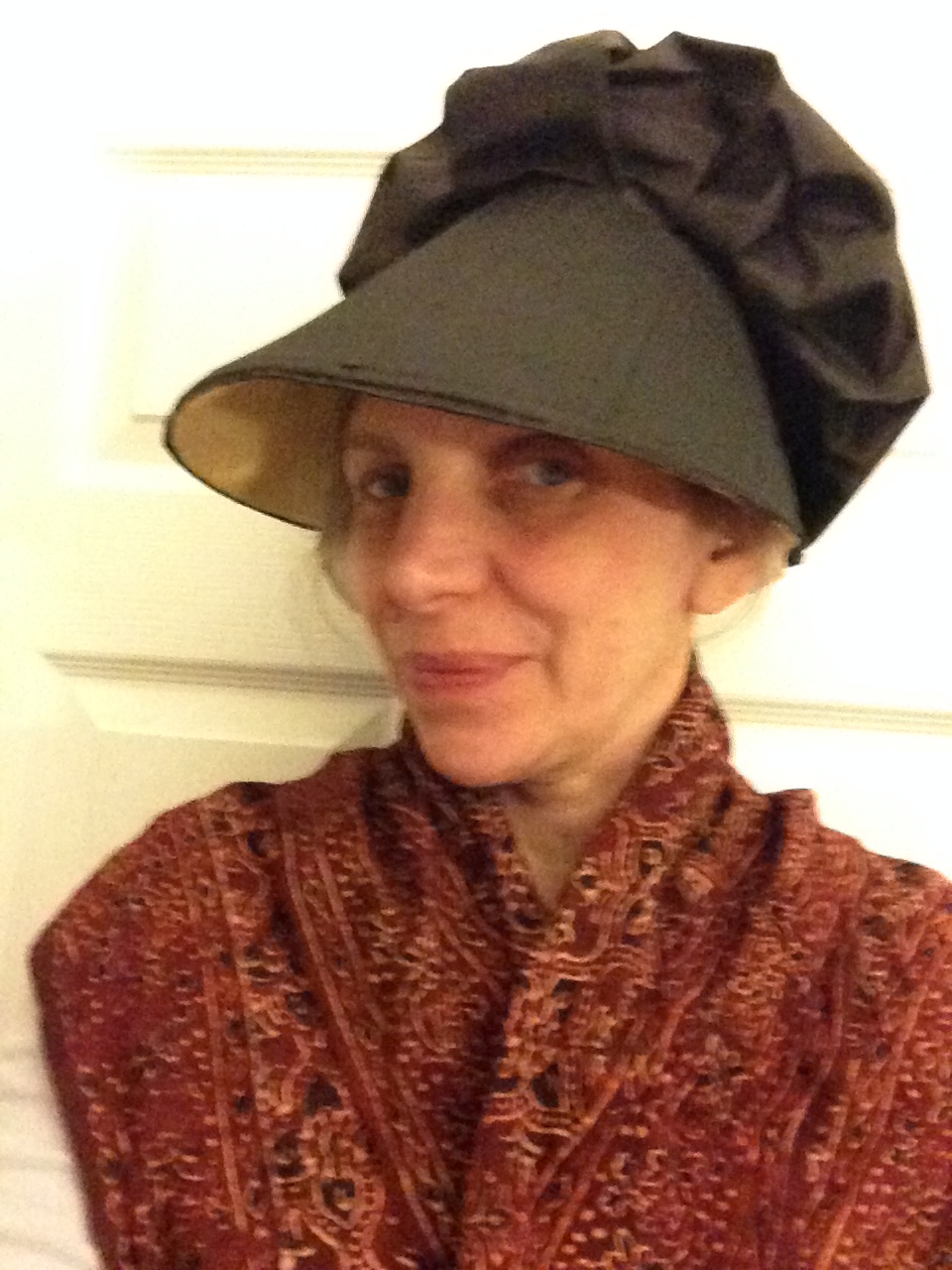 As you can see, the bonnet does have some lamp-shade-like tendencies on my head, which I consider a benefit. I like the way the ribs are visible, even if I remain unconvinced by the caning. I think it’s a little too wide, and lacks resiliency, though to be honest, I have only felt baleen at the New Bedford Whaling Museum, where there is a large sample on the second floor.