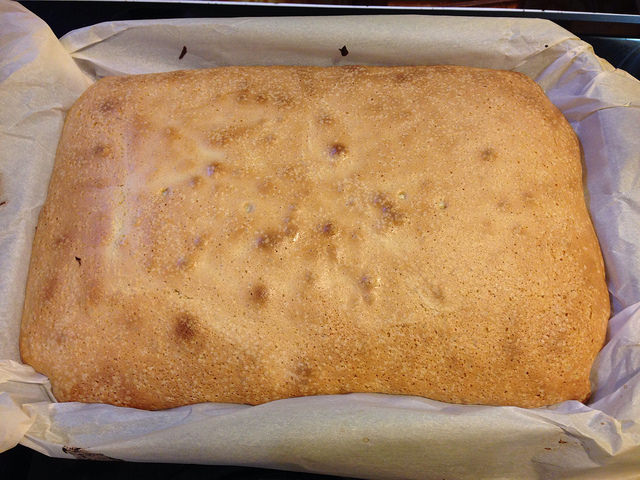 Like Gudmundsson, I also lined a glass pan with parchment paper, but my (electric, rental-quality) oven runs a little slow, so baked for 30 minutes at 400F.