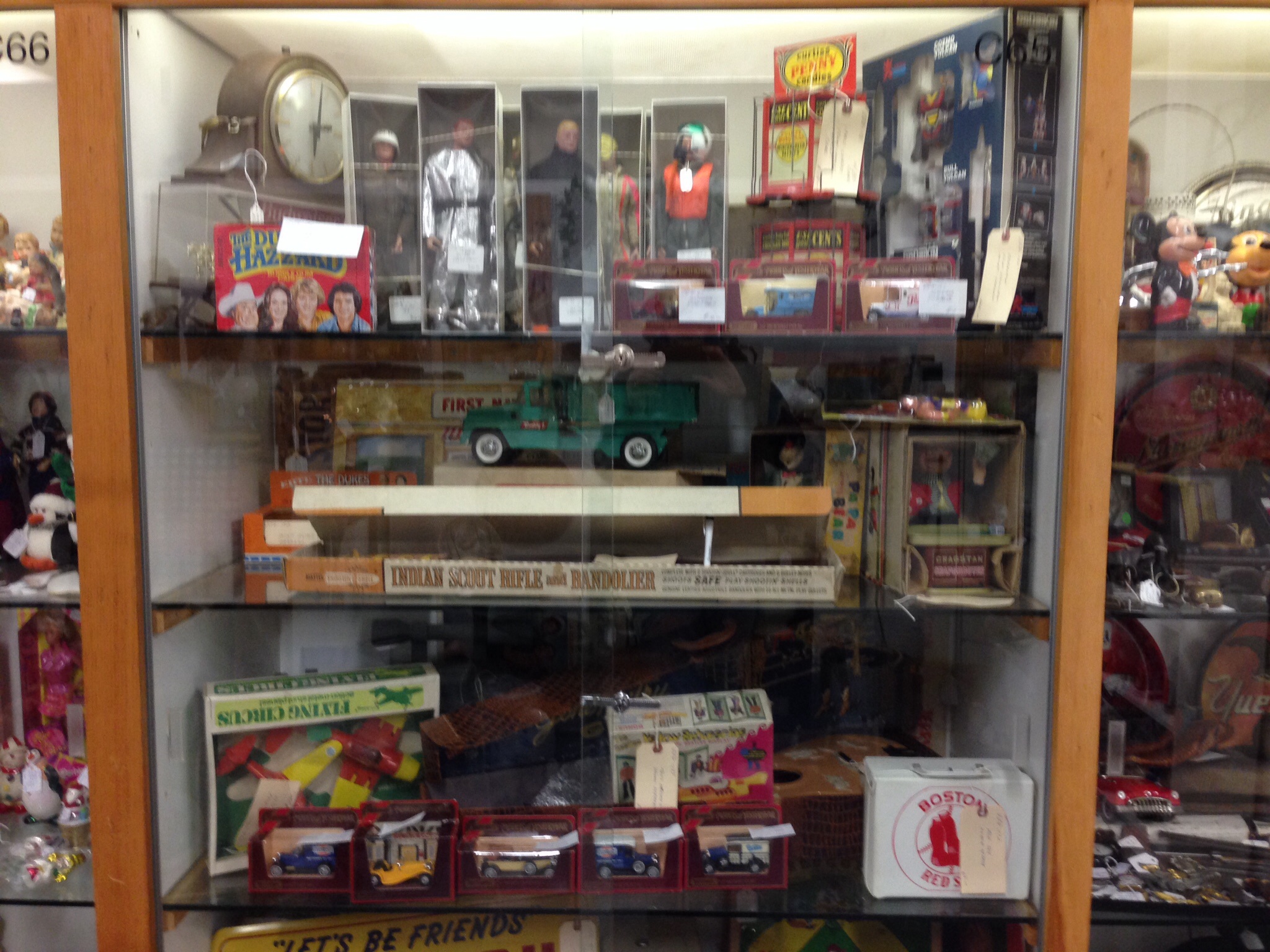 Here’s an entire case that might come to life in an episode of Futurama, but it’s full of stuff for nostalgic guys: G.I. Joe in Crash Team suit, Planet of the Apes figures, Captain Kirk, and the Indian Scout Rifle and Bandolier. Cars, trucks, a flying circus: here’s a man’s past for him to admire without the responsibility of keeping it up. These are social experiences, where people wander through and talk about their objects, the things they owned, or coveted, the memories they have, the future they imagine.