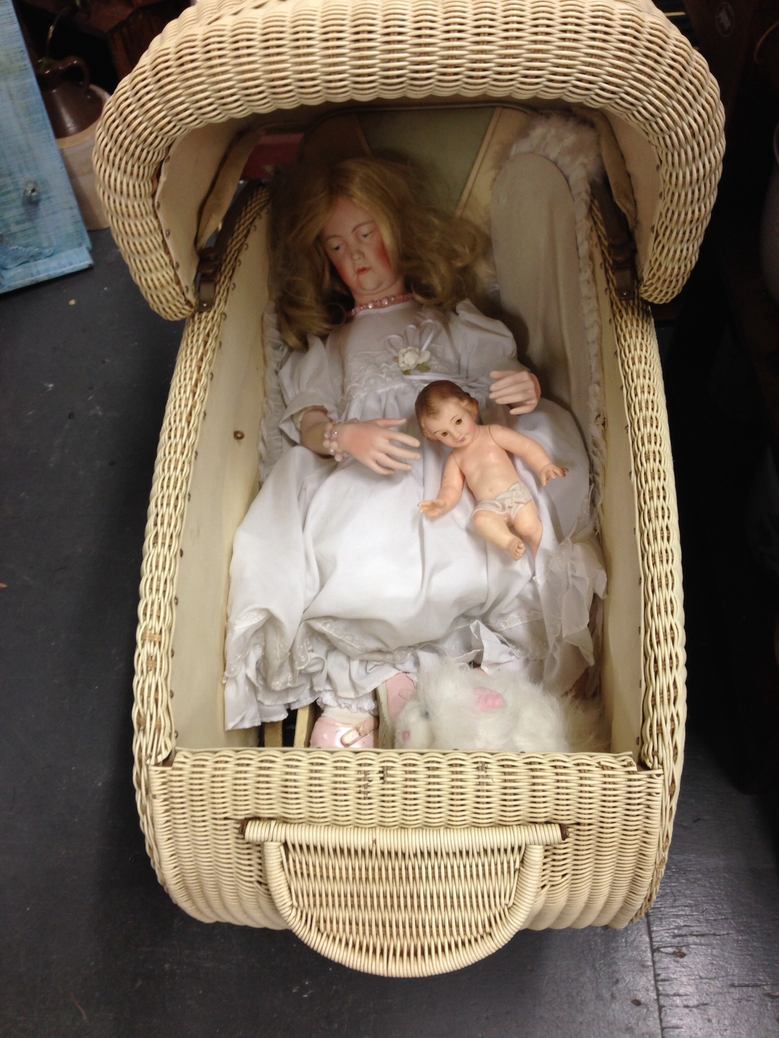 The carriage, while heavy, had an amazingly smooth suspension system unlike any pram I’ve ever pushed at home or elsewhere. I couldn’t tell you what Mary and Jesus and a plush Persian cat were doing in a pram, but I do recognize the care with which they have been arranged, and the whiteness of the display, which speaks perhaps to the universal innocence of this trio. Someone chose this, deliberately. This isn’t art, or hipsterism, this is as genuine as the doo-wop songs on the 1950s radio station chosen by the antique mall.
