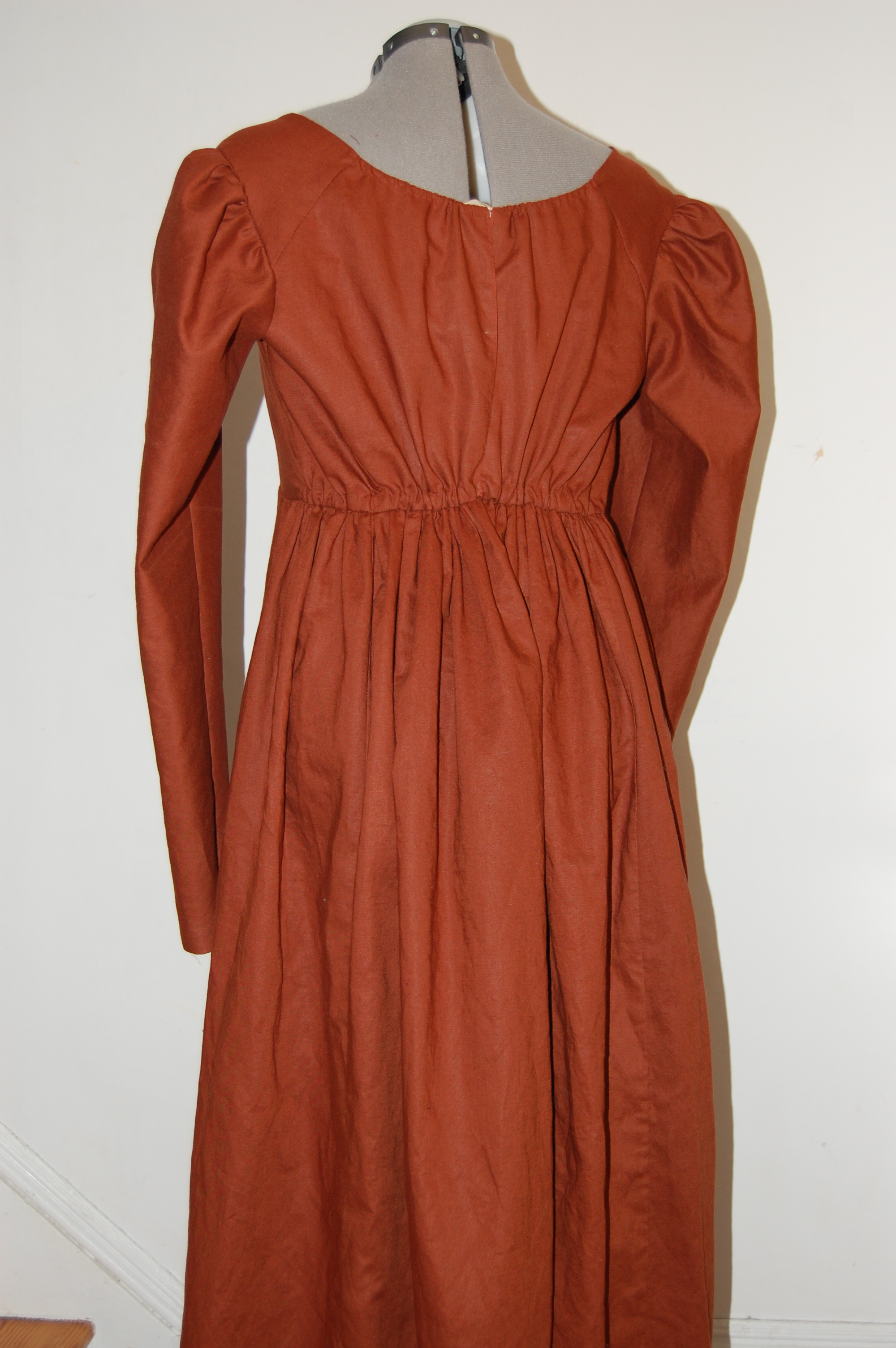 The back closes with a drawstring at neck and waist, as simple as possible. Mr S and I discovered that fitting a bodice back was deleterious to our relationship, so drawstrings won over buttons. I can tie the lower string, but not the upper– annoying, as I was trying to make a gown that was easy enough to put on solo at 4:30 AM. Vanity won over a pinned apron front gown, though I know they exist in Rhode Island collections. The skritchy rust-brown cotton pays homage to that extant garment, which is a rough homespun brown wool. I may not be stylin’ extant, but I’ll be itching correctly.