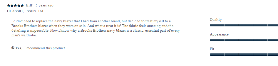 It’s a classic look, often seen in the preppier enclaves. It’s an easy target, but don’t you love this review of a Brooks Brothers blue blazer by Biff? Timeless.
