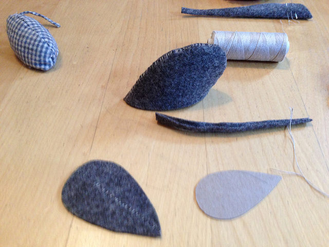 The pieces are simple: two mousey-shaped backs, a roughly oval pasteboard base, a strippy scrap for a tail, wool batting, and catnip. Linen thread for stotting, whipstitching, and whiskers. Stitch the backs together (I had to piece the base from a scrap, so stotted bits to look like a mouse hide. Why not?)