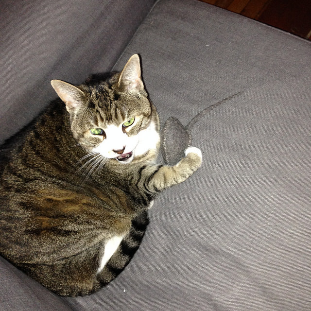 All you need to do now is hand the mouse over and back away. Kitty requests some privacy with her new mouse. There’s a flickr album if you want to see the progress photos of a quick and silly project and make your own Wooly Mouse for Progressive Pussy Cats.