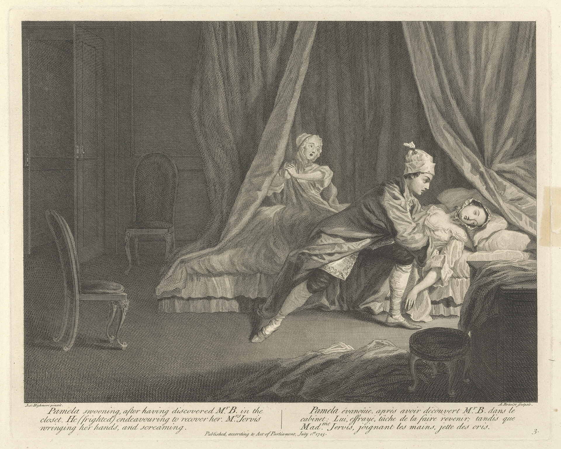 Print made by Guillaume Philippe Benoist, 1725–ca. 1770, French, Pamela Swooning, after having discovered Mr. B. in the closet, He (frighted) endeavouring to recover her, Mrs. Jervis wringing her hands, and screaming, 1745, Etching with stipple engraving on medium, slightly textured, cream laid paper, Yale Center for British Art, Yale Art Gallery Collection, Gift of the Library Associates.