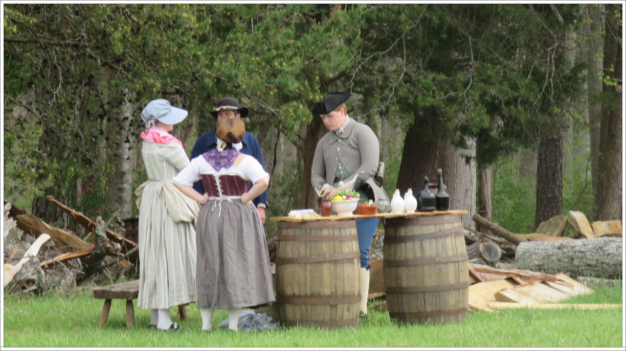 It was a simple set up: two barrels, a board, my frail, and me. (I could really use a wheelbarrow, and a rain deck. At least the rain deck is something I can make myself.) But this was more than adequate to sell luxury goods (rum, whiskey, radishes, and ginger candy) to the soldiers at Fort Dobbs.