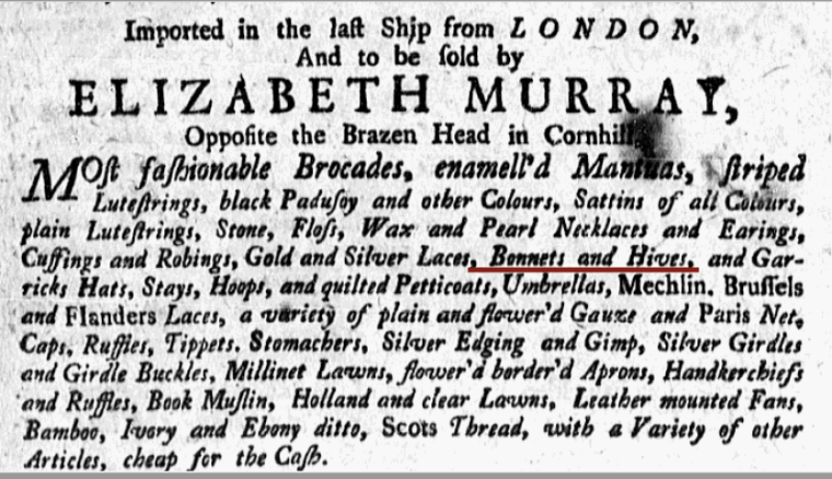 A Bee in my Bonnet 10 Sunday May 2020 Original size at 835 × 481 ≈ Leave a comment Boston Evening Post, June 30, 1755