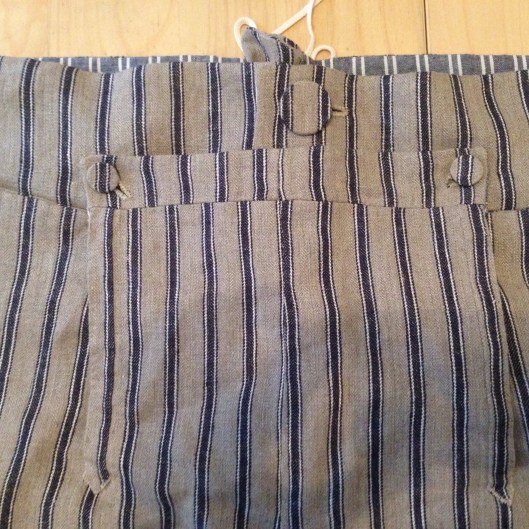 He’s also got a roundabout in the works, which I must focus on more closely to finish. This is patterned from an original in Henry Cooke’s collection, but… Mr. Cooke and I, on a very sticky Tuesday afternoon, did not have the Young Mr at hand to measure again. The original was too small: that we knew. What we did not know was that the boy had taken on a man’s shape– or, as a friend says, “he’s dude-shaped now!”–and the additions we made were not enough, except (barely) to the sleeves.