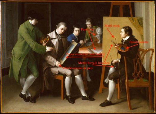 Once again, I’m looking into artists’ materials and techniques, though instead of trying to kit myself out for the early Federal era, I’m digging into the last half (quarter) of the 18th century. It seems to be a time of rapid transitions in art materials as new pigments and media are developed. While Mr. Juel is beginning a work in oils, we still see some of the same tools that a watercolorist would use. Brushes, though his are shaped for working in oil; a shell, perhaps to combine pigment with medium, and bags of paint.