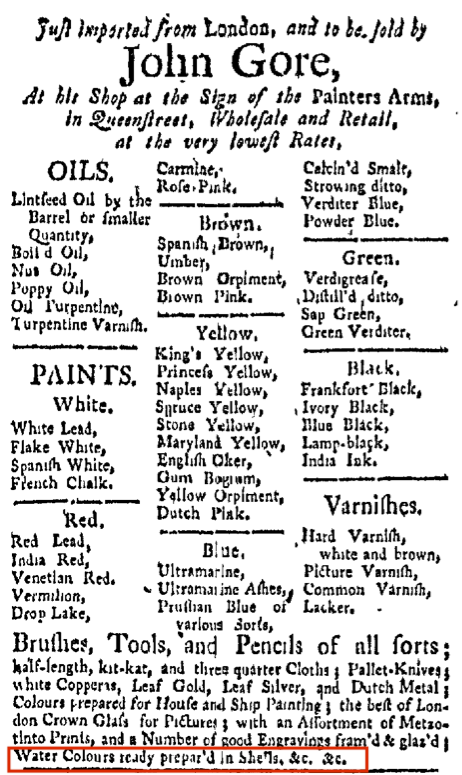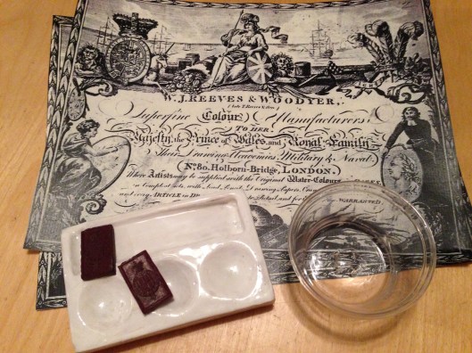 To date, I’ve found conservation reports more helpful than anything else, especially those analyzing paint content for sugars and gums. (One of the keys to watercolors was the re-wettable aspect of the colors; gum arabic, gum tragacanth and honey or sugar were ingredients used in varying proportions to achieve what we now take for granted.) The first watercolor cakes or blocks are introduced in 1780 by William Reeves; often, these were very hard, and had to be agitated in water (ground on a surface) to be used, much like sumi-e ink. Once paint was ground with water, it could be dried in a dish or container for re-wetting and later use. The question of course is, what do dry it in? How do you mix and use the paint?
