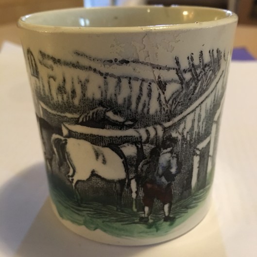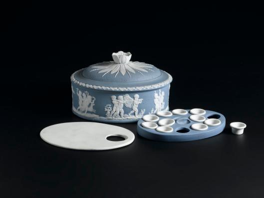 In the CWP portrait of JP, the slightly open drawer of the painting stand may be giving us a peek at his palette; the simple tumbler of water helps confirm that he is working in watercolor on ivory, and give us a sense of what kind of water container artists used– which, happily, can be more easily sourced than Mr Peale’s box.