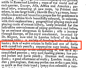 Once again, I’m looking into artists’ materials and techniques, though instead of trying to kit myself out for the early Federal era, I’m digging into the last half (quarter) of the 18th century. It seems to be a time of rapid transitions in art materials as new pigments and media are developed. While Mr. Juel is beginning a work in oils, we still see some of the same tools that a watercolorist would use. Brushes, though his are shaped for working in oil; a shell, perhaps to combine pigment with medium, and bags of paint.