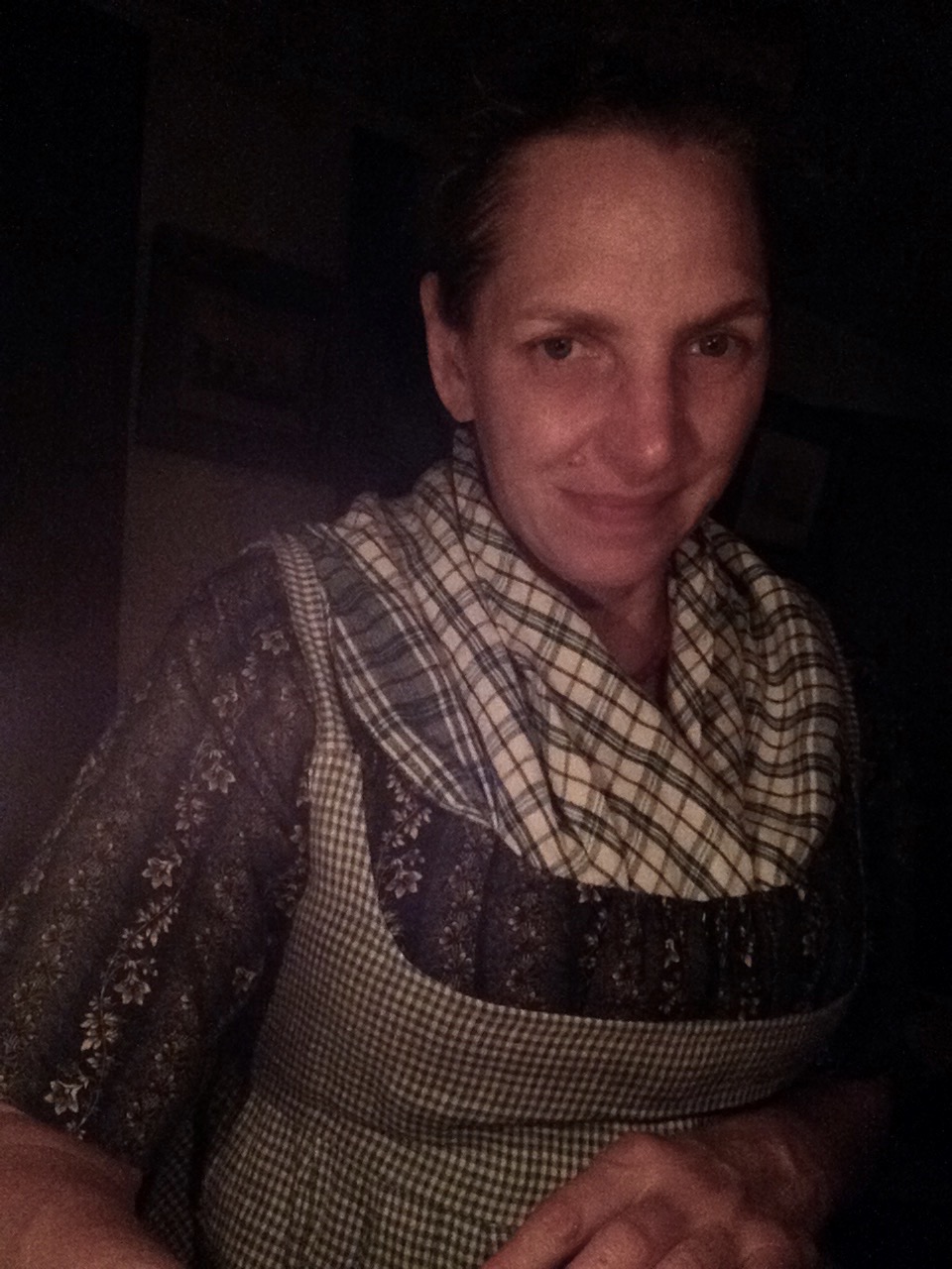 A new time period meant a new dress. And a new bonnet. And new hair– that last complicated by the new summer haircut. (I had a wool gown from the Turkey Shoot several years ago, but wool in August at Sturbridge is possible but not recommended.) So, what to wear? I remembered some lightweight chintz gowns in the Kyoto Costume Institute collections, and happily there’s one on their website (my copy of the book is still in storage). While I prefer the audacity of many of the reproduction cotton prints, the hand of the quilting cottons is often heavier than I want, so I ordered a print from India– one that has been used for many other dresses in different time periods.