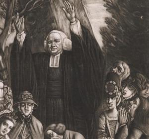 What about shape? For those dressing a la mode, we are past the deep-brimmed, small-cauled “lampshade” of the 1760s, and into a smaller, tighter bonnet with a larger caul and more trimming. In the portrait of Miss Palmer, we see how the brim stands away from the face, and the caul or crown poufs up. “A Lady’s Maid Purchasing a Leek” and “The Rival Milleners” (aee above) both depict women in similarly tight-brimmed and round-crowned bonnets trimmed with bows. These are shapes that I am confident appeared almost universally (with variations) in the American colonies in the first years of the 1770s. Now, there are different shapes to be sure, but these seem to predominate. I do think we need to see more brims that wrap around the head, as seen in the 1774 mezzotint of George Whitefield (Anglo-America’s most popular preacher) and his followers.