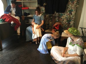 Once I settled on making the bonnet, I decided it was time to finish a pink wool petticoat I started in 2015 after a trip to Mood. It’s a tropical weight Australian wool, according to its selvedge, and has a high-waisted bodice with a drawstring closure. I covered the bottom drawstring (and added some bling) with a black velvet belt closed with a period paste buckle. (Every now and then someone doesn’t know what they’ve got, and lets it go for a price I can afford.) On top, the gathered back cotton velveteen canezou/Spencer made for my first trip to Genesee. Having a wardrobe extensive enough to mix-and-match almost the way I do from my modern closet is pretty satisfying, if a little crowded.