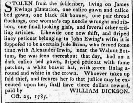 Looking at runaway ads, prints, and extant garments, it began to dawn on me that really, the preferred garment fabric was a print, sometimes printed linen (“washed until the flowers have faded nearly white,” in one instance) but often printed cotton, calico, or chintz. In one ad, a servant wearing a dark calico bed gown ran away with a calico gown and a calico bedgown, and must have made a colorful sight with her striped petticoat– and a small looking glass.